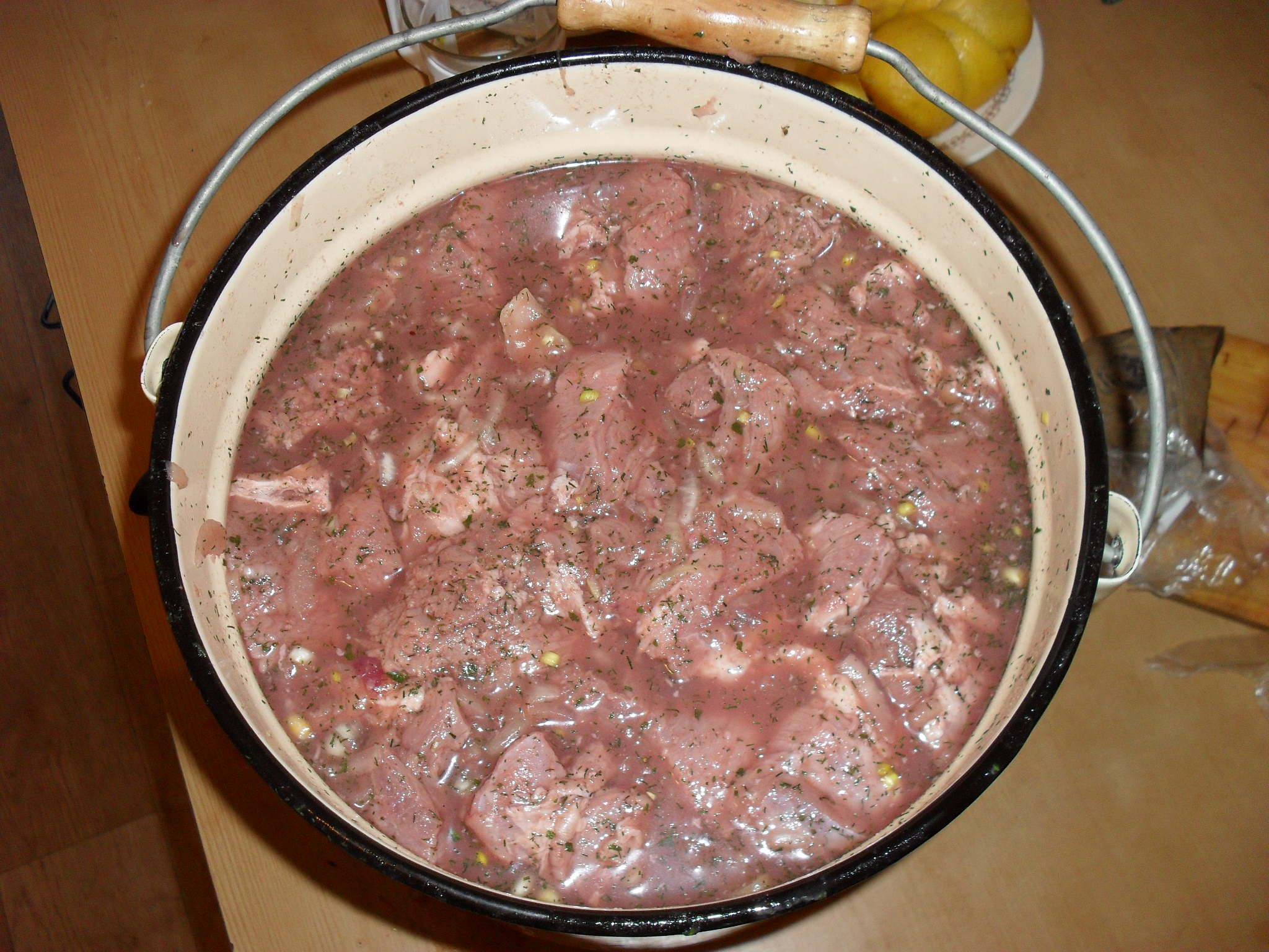 добавляем 4 ст.л растительного масла!! (опять перемешиваем)Держим час свободно, потом на 5 часов под гнётом.. потм 2 часа свободы... после этого, мясо уже можно готовить... (желательно после гнёта перемешать)))
